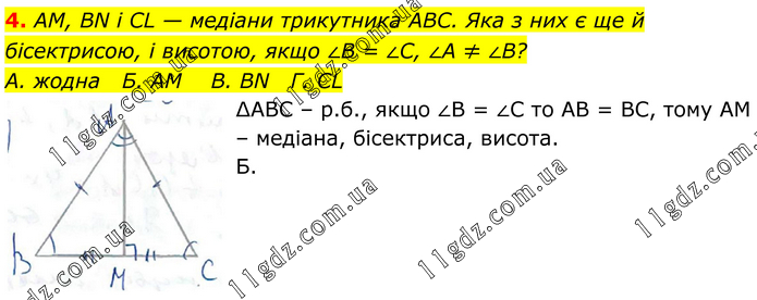 АМ, BN і СL — медіани трикутника АВС. Яка з них є ще й бісектрисою, і висотою, якщо ∠В = ∠С, ∠А ≠ ∠B? А. жодна Б. АМ В. ВN Г. СL ∆АВС – р.б., якщо ∠В = ∠С то АВ = ВС, тому АМ – медіана, бісектриса, висота. Б.