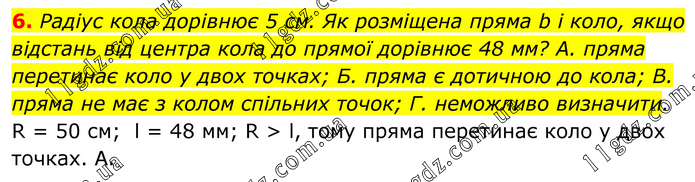 Радіус кола дорівнює 5 см. Як розміщена пряма b і коло, якщо відстань від центра кола до прямої дорівнює 48 мм? A. пряма перетинає коло у двох точках; Б. пряма є дотичною до кола; B. пряма не має з колом спільних точок; Г. неможливо визначити. R = 50 см; l = 48 мм; R > l, тому пряма перетинає коло у двох точках. А.