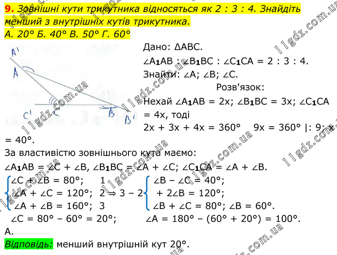 Зовнішні кути трикутника відносяться як 2 : 3 : 4. Знайдіть менший з внутрішніх кутів трикутника. А. 20° Б. 40° В. 50° Г. 60° Дано: ∆АВС. ∠А1АВ : ∠В1ВС : ∠С1СА = 2 : 3 : 4. Знайти: ∠А; ∠В; ∠С. Розв'язок: Нехай ∠А1АВ = 2х; ∠В1ВС = 3х; ∠С1СА = 4х, тоді 2x + 3x + 4x = 360° 9x = 360° |: 9; x = 40°. За властивістю зовнішнього кута маємо: ∠А1АВ = ∠С + ∠В, ∠В1ВС = ∠А + ∠С; ∠С1СА = ∠А + ∠В. ∠С + ∠В = 80°; 1 ∠В – ∠С = 40°; ∠А + ∠С = 120°; 2 ⇒ 3 – 2 + 2∠В = 120°; ∠А + ∠В = 160°; 3 ∠В + ∠С = 80°; ∠В = 60°. ∠C = 80° – 60° = 20°; ∠A = 180° – (60° + 20°) = 100°. A. Відповідь: менший внутрішній кут 20°.