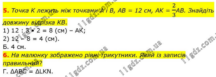 5. Точка K лежить між точками А і В, AB = 12 см, AK = 2/3АВ. Знайдіть довжину відрізка KB. 1) 12 : 3 • 2 = 8 (см) – АК; 2) 12 – 8 = 4 (см). Б. 4 см. 6. На малюнку зображено рівні трикутники. Який із записів правильний? Г. ΔABC = ΔLKN.