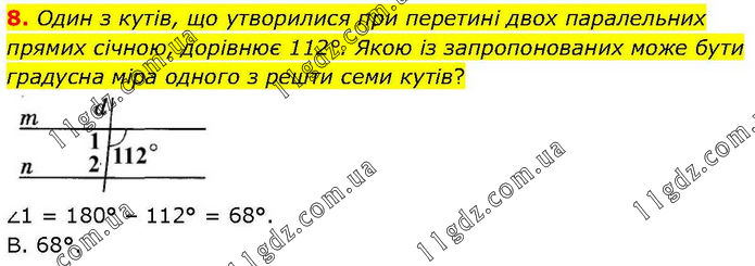 8. Один з кутів, що утворилися при перетині двох паралельних прямих січною, дорівнює 112°. Якою із запропонованих може бути градусна міра одного з решти семи кутів? ∠1 = 180° – 112° = 68°. В. 68°.