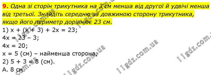 9. Одна зі сторін трикутника на 3 см менша від другої й удвічі менша від третьої. Знайдіть середню за довжиною сторону трикутника, якщо його периметр дорівнює 23 см. 1) х + (х + 3) + 2х = 23; 4х = 23 – 3; 4х = 20; х = 5 (см) – найменша сторона; 2) 5 + 3 = 8 (см). А. 8 см.