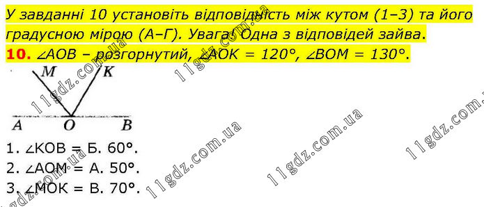 У завданні 10 установіть відповідність між кутом (1–3) та його градусною мірою (А–Г). Увага! Одна з відповідей зайва. 10. ∠AOB – розгорнутий, ∠AOK = 120°, ∠BOM = 130°. 1. ∠KOB = Б. 60°. 2. ∠АОМ = А. 50°. 3. ∠МОК = В. 70°.