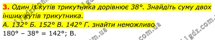 Один із кутів трикутника дорівнює 38°. Знайдіть суму двох інших кутів трикутника. А. 132° Б. 152° В. 142° Г. знайти неможливо 180° – 38° = 142°; В.