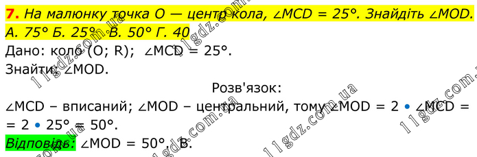 На малюнку точка О — центр кола, ∠МСD = 25°. Знайдіть ∠МОD. A. 75° Б. 25° B. 50° Г. 40 Дано: коло (O; R); ∠MCD = 25°. Знайти: ∠MOD. Розв'язок: ∠MCD – вписаний; ∠MOD – центральний, тому ∠MOD = 2 • ∠MCD = = 2 • 25° = 50°. Відповідь: ∠MOD = 50°. B.