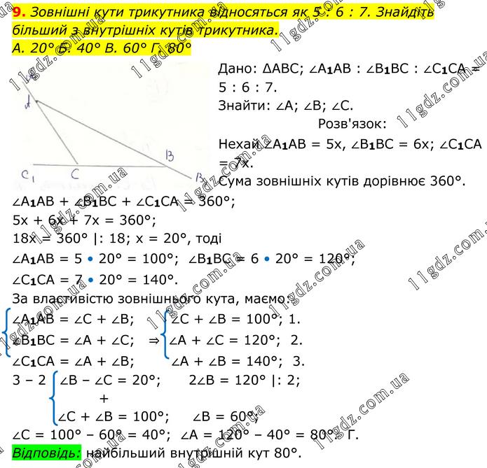 Зовнішні кути трикутника відносяться як 5 : 6 : 7. Знайдіть більший з внутрішніх кутів трикутника. А. 20° Б. 40° В. 60° Г. 80° Дано: ∆АВС; ∠А1АВ : ∠В1ВС : ∠С1СА = 5 : 6 : 7. Знайти: ∠A; ∠B; ∠C. Розв'язок: Нехай ∠А1АВ = 5x, ∠B1BC = 6x; ∠C1CA = 7x. Сума зовнішніх кутів дорівнює 360°. ∠А1АВ + ∠В1ВС + ∠С1СА = 360°; 5x + 6x + 7x = 360°; 18x = 360° |: 18; x = 20°, тоді ∠А1АВ = 5 • 20° = 100°; ∠В1ВС = 6 • 20° = 120°; ∠С1СА = 7 • 20° = 140°. За властивістю зовнішнього кута, маємо: ∠А1АВ = ∠С + ∠B; ∠C + ∠B = 100°; 1. ∠В1ВС = ∠A + ∠C; ⇒ ∠A + ∠C = 120°; 2. ∠С1СА = ∠A + ∠B; ∠A + ∠B = 140°; 3. 3 – 2 ∠B – ∠C = 20°; 2∠B = 120° |: 2; + ∠C + ∠B = 100°; ∠B = 60°; ∠C = 100° – 60° = 40°; ∠A = 120° – 40° = 80°. Г. Відповідь: найбільший внутрішній кут 80°.