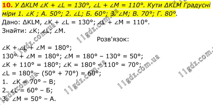 У ∆КLМ ∠К + ∠L = 130°, ∠L + ∠М = 110°. Кути ∆КLМ Градусні міри 1. ∠К ; A. 50°; 2. ∠L; Б. 60°; 3. ∠М; B. 70°; Г. 80°. Дано: ∆KLM, ∠K + ∠L = 130°; ∠L + ∠M = 110°. Знайти: ∠K; ∠L; ∠M. Розв'язок: ∠K + ∠L + ∠M = 180°; 130° + ∠M = 180°; ∠M = 180° – 130° = 50°; ∠K + 110° = 180°; ∠K = 180° – 110° = 70°; ∠L = 180° – (50° + 70°) = 60°; 1. ∠K = 70° – B; 2. ∠L = 60° – Б; 3. ∠М = 50° – A.