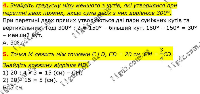 4. Знайдіть градусну міру меншого з кутів, які утворилися при перетині двох прямих, якщо сума двох з них дорівнює 300°. При перетині двох прямих утворюються дві пари суміжних кутів та вертикальних. Тоді 300° : 2 = 150° – більший кут. 180° – 150° = 30° – менший кут. А. 30°. 5. Точка M лежить між точками C i D, CD = 20 см, CM = 3/4CD. Знайдіть довжину відрізка MD. 1) 20 : 4 • 3 = 15 (см) – СМ; 2) 20 – 15 = 5 (см). Б. 5 см.