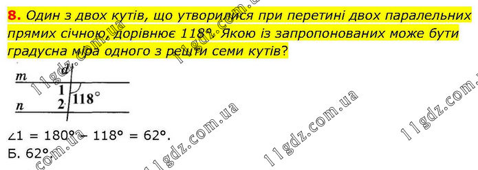 8. Один з двох кутів, що утворилися при перетині двох паралельних прямих січною, дорівнює 118°. Якою із запропонованих може бути градусна міра одного з решти семи кутів? ∠1 = 180° – 118° = 62°. Б. 62°.