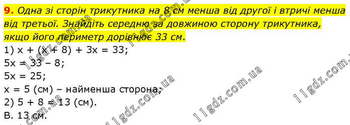 9. Одна зі сторін трикутника на 8 см менша від другої і втричі менша від третьої. Знайдіть середню за довжиною сторону трикутника, якщо його периметр дорівнює 33 см. 1) х + (х + 8) + 3х = 33; 5х = 33 – 8; 5х = 25; х = 5 (см) – найменша сторона; 2) 5 + 8 = 13 (см). В. 13 см.