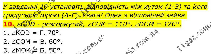 У завданні 10 установіть відповідність між кутом (1-3) та його градусною мірою (А-Г). Увага! Одна з відповідей зайва. 10. ∠COD - розгорнутий, ∠COK = 110°, ∠DOM = 120°. 1. ∠KOD = Г. 70°. 2. ∠СОМ = В. 60°. 3. ∠МОК = Б. 50°.