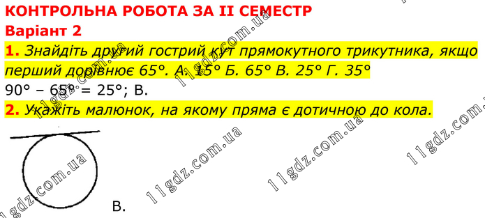 КОНТРОЛЬНА РОБОТА ЗА II СЕМЕСТР Варіант 2 1. Знайдіть другий гострий кут прямокутного трикутника, якщо перший дорівнює 65°. А. 15° Б. 65° В. 25° Г. 35° 90° – 65° = 25°; B. 2. Укажіть малюнок, на якому пряма є дотичною до кола. B.