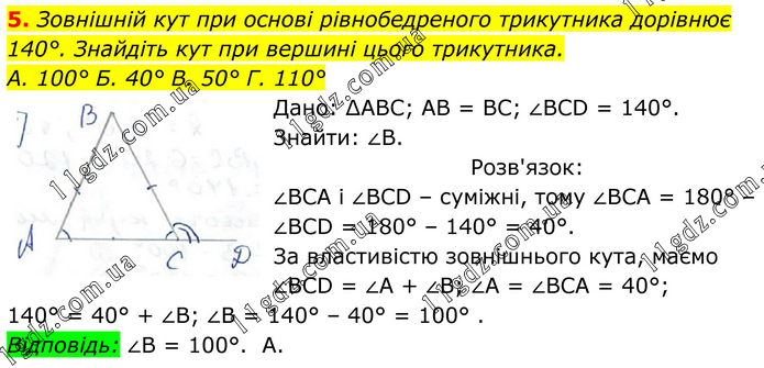 Зовнішній кут при основі рівнобедреного трикутника дорівнює 140°. Знайдіть кут при вершині цього трикутника. А. 100° Б. 40° В. 50° Г. 110° Дано: ∆АВС; АВ = ВС; ∠BCD = 140°. Знайти: ∠В. Розв'язок: ∠ВСА і ∠BCD – суміжні, тому ∠ВСА = 180° – ∠BCD = 180° – 140° = 40°. За властивістю зовнішнього кута, маємо ∠BCD = ∠A + ∠B; ∠A = ∠BCA = 40°; 140° = 40° + ∠B; ∠B = 140° – 40° = 100° . Відповідь: ∠В = 100°. А.
