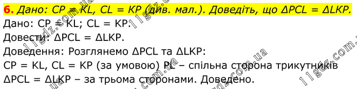 Дано: СР = КL, СL = КР (див. мал.). Доведіть, що ∆РСL = ∆LКР. Дано: СР = KL; CL = KP. Довести: ∆PCL = ∆LKP. Доведення: Розглянемо ∆PCL та ∆LKP: CP = KL, CL = KP (за умовою) PL – спільна сторона трикутників ∆PCL = ∆LKP – за трьома сторонами. Доведено.