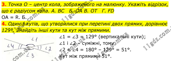 3. Точка О – центр кола, зображеного на малюнку. Укажіть відрізок, що є радіусом кола. A. ВС Б. ОА B. ОТ Г. FD OA = R. Б. 4. Один з кутів, що утворилися при перетині двох прямих, дорівнює 129°. Знайдіть інші кути та кут між прямими. ∠1 = ∠3 = 129° (вертикальні кути); ∠1 і ∠2 – суміжні, тому ∠2 = ∠4 = 180° – 129° = 51°. Кут між прямими 51°.