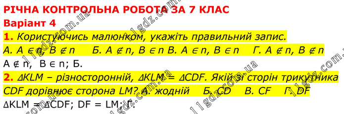 РІЧНА КОНТРОЛЬНА РОБОТА ЗА 7 КЛАС Варіант 4 1. Користуючись малюнком, укажіть правильний запис. A. А ∈ n, В ∉ n Б. А ∉ n, В ∈ n B. А ∈ n, В ∈ n Г. А ∉ n, В ∉ n A ∉ n, B ∈ n; Б. 2. ∆КLМ – різносторонній, ∆КLМ = ∆СDF. Якій зі сторін трикутника СDF дорівнює сторона LМ? А. жодній Б. СD В. СF Г. DF ∆KLM = ∆CDF; DF = LM; Г.