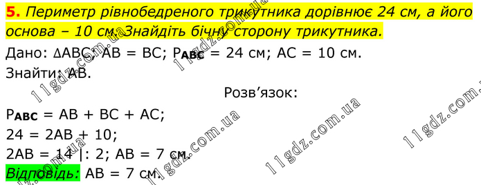 Периметр рівнобедреного трикутника дорівнює 24 см, а його основа – 10 см. Знайдіть бічну сторону трикутника. Дано: ∆АВС; АВ = ВС; РАВС = 24 см; АС = 10 см. Знайти: АВ. Розв’язок: РАВС = АВ + ВС + АС; 24 = 2АВ + 10; 2АВ = 14 |: 2; АВ = 7 см. Відповідь: АВ = 7 см.