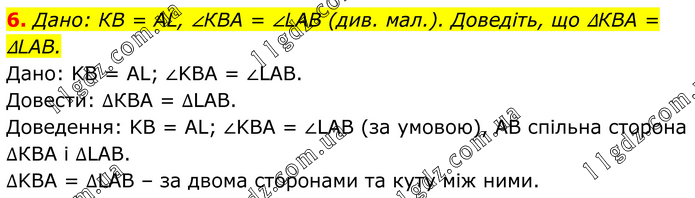 Дано: КВ = АL, ∠КВА = ∠LАВ (див. мал.). Доведіть, що ∆КВА = ∆LАВ. Дано: KB = AL; ∠KBA = ∠LAB. Довести: ∆КВА = ∆LAB. Доведення: KB = AL; ∠KBA = ∠LAB (за умовою), АВ спільна сторона ∆КВА і ∆LAB. ∆KBA = ∆LAB – за двома сторонами та куту між ними.