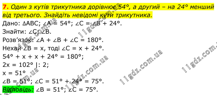 Один з кутів трикутника дорівнює 54°, а другий – на 24° менший від третього. Знайдіть невідомі кути трикутника. Дано: ∆АВС; ∠А = 54°; ∠С = ∠В + 24°. Знайти: ∠С; ∠В. Розв’язок: ∠А + ∠В + ∠С = 180°. Нехай ∠В = х, тоді ∠С = х + 24°. 54° + х + х + 24° = 180°; 2х = 102° |: 2; х = 51° ∠В = 51°; ∠С = 51° + 24° = 75°. Відповідь: ∠В = 51°; ∠С = 75°.