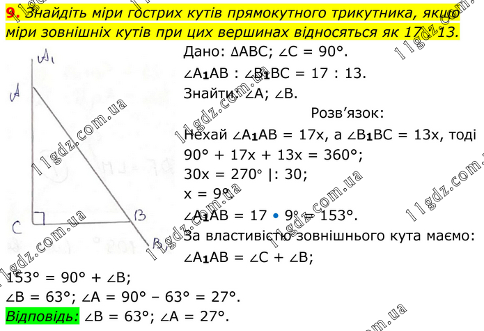 Знайдіть міри гострих кутів прямокутного трикутника, якщо міри зовнішніх кутів при цих вершинах відносяться як 17 : 13. Дано: ∆АВС; ∠С = 90°. ∠А1АВ : ∠В1ВС = 17 : 13. Знайти: ∠А; ∠В. Розв’язок: Нехай ∠А1АВ = 17х, а ∠В1ВС = 13х, тоді 90° + 17х + 13х = 360°; 30х = 270° |: 30; х = 9°. ∠А1АВ = 17 • 9° = 153°. За властивістю зовнішнього кута маємо: ∠А1АВ = ∠С + ∠В; 153° = 90° + ∠В; ∠В = 63°; ∠А = 90° – 63° = 27°. Відповідь: ∠В = 63°; ∠А = 27°.