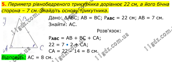 Периметр рівнобедреного трикутника дорівнює 22 см, а його бічна сторона – 7 см. Знайдіть основу трикутника. Дано: ∆АВС; АВ = ВС; РАВС = 22 см; АВ = 7 см. Знайти: АС. Розв'язок: РАВС = АВ + ВС + СА; 22 = 7 • 2 + СА; СА = 22 – 14 = 8 см. Відповідь: АС = 8 см.
