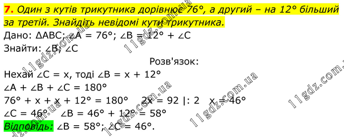 Один з кутів трикутника дорівнює 76°, а другий – на 12° більший за третій. Знайдіть невідомі кути трикутника. Дано: ∆АВС; ∠А = 76°; ∠В = 12° + ∠С Знайти: ∠В; ∠С Розв'язок: Нехай ∠С = x, тоді ∠В = x + 12° ∠A + ∠B + ∠C = 180° 76° + x + x + 12° = 180° 2x = 92 |: 2 x = 46° ∠C = 46° ∠B = 46° + 12° = 58° Відповідь: ∠В = 58°; ∠С = 46°.