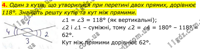 Один з кутів, що утворилися при перетині двох прямих, дорівнює 118°. Знайдіть решту кутів та кут між прямими. ∠1 = ∠3 = 118° (як вертикальні); ∠2 і ∠1 – суміжні, тому ∠2 = ∠4 = 180° – 118° = 62°. Кут між прямими дорівнює 62°.