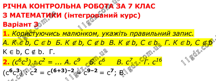 РІЧНА КОНТРОЛЬНА РОБОТА ЗА 7 КЛАС З МАТЕМАТИКИ (інтегрований курс) Варіант З 1. Користуючись малюнком, укажіть правильний запис. A. К ∈ b, С ∈ b Б. К ∉ b, С ∉ b B. К ∉ b, С ∈ b Г. К ∈ b, С ∉ b K ∈ b, C ∉ b. Г. 2. (с6с3) : с2 = ... А. с9 Б. с6 В. с7 Г. с16 (с6с3) : с2 = с(6+3)–2 = с9–2 = с7; В.