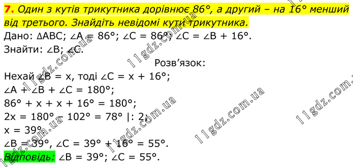 Один з кутів трикутника дорівнює 86°, а другий – на 16° менший від третього. Знайдіть невідомі кути трикутника. Дано: ∆АВС; ∠А = 86°; ∠С = 86°; ∠С = ∠В + 16°. Знайти: ∠В; ∠С. Розв’язок: Нехай ∠В = х, тоді ∠С = х + 16°; ∠А + ∠В + ∠С = 180°; 86° + х + х + 16° = 180°; 2х = 180° – 102° = 78° |: 2; х = 39°. ∠В = 39°, ∠С = 39° + 16° = 55°. Відповідь: ∠В = 39°; ∠С = 55°.