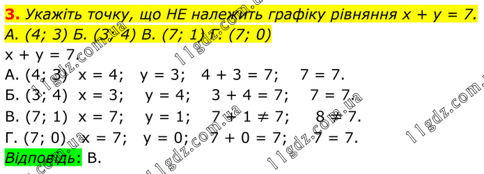 3. Укажіть точку, що НЕ належить графіку рівняння х + у = 7. А. (4; 3) Б. (3; 4) В. (7; 1) Г. (7; 0) х + у = 7. А. (4; 3) х = 4; у = 3; 4 + 3 = 7; 7 = 7. Б. (3; 4) х = 3; у = 4; 3 + 4 = 7; 7 = 7. В. (7; 1) х = 7; у = 1; 7 + 1 ≠ 7; 8 ≠ 7. Г. (7; 0) х = 7; у = 0; 7 + 0 = 7; 7 = 7. Відповідь: В.