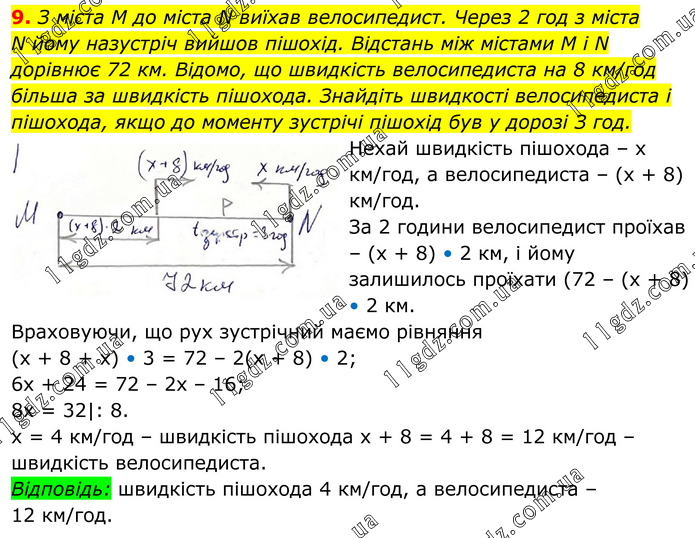 З міста М до міста N виїхав велосипедист. Через 2 год з міста N йому назустріч вийшов пішохід. Відстань між містами М і N дорівнює 72 км. Відомо, що швидкість велосипедиста на 8 км/год більша за швидкість пішохода. Знайдіть швидкості велосипедиста і пішохода, якщо до моменту зустрічі пішохід був у дорозі З год. Нехай швидкість пішохода – х км/год, а велосипедиста – (х + 8) км/год. За 2 години велосипедист проїхав – (х + 8) • 2 км, і йому залишилось проїхати (72 – (х + 8) • 2 км. Враховуючи, що рух зустрічний маємо рівняння (х + 8 + х) • 3 = 72 – 2(х + 8) • 2; 6х + 24 = 72 – 2х – 16; 8х = 32|: 8. x = 4 км/год – швидкість пішохода х + 8 = 4 + 8 = 12 км/год – швидкість велосипедиста. Відповідь: швидкість пішохода 4 км/год, а велосипедиста – 12 км/год.