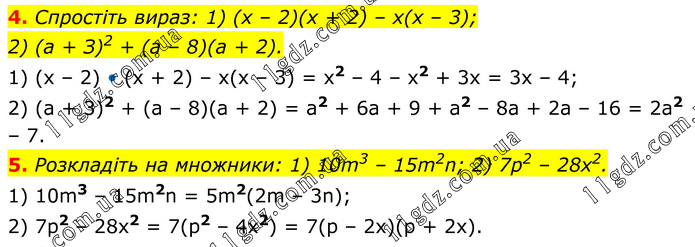 4. Спростіть вираз: 1) (x – 2)(х + 2) – х(х – 3); 2) (а + З)2 + (а – 8)(а + 2). 1) (x – 2) • (x + 2) – x(x – 3) = x2 – 4 – x2 + 3x = 3x – 4; 2) (a + 3)2 + (a – 8)(a + 2) = a2 + 6a + 9 + a2 – 8a + 2a – 16 = 2a2 – 7. 5. Розкладіть на множники: 1) 10m3 – 15m2n; 2) 7р2 – 28x2. 1) 10m3 – 15m2n = 5m2(2m – 3n); 2) 7p2 – 28x2 = 7(p2 – 4x2) = 7(p – 2x)(p + 2x).