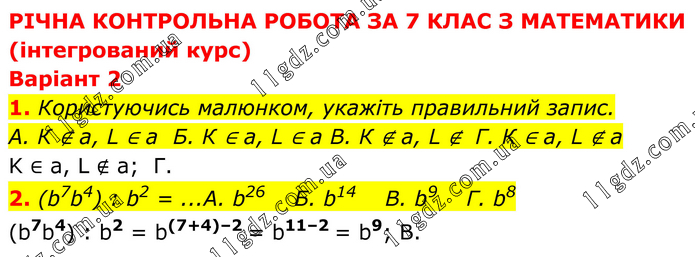 РІЧНА КОНТРОЛЬНА РОБОТА ЗА 7 КЛАС З МАТЕМАТИКИ (інтегрований курс) Варіант 2 1. Користуючись малюнком, укажіть правильний запис. A. К ∉ а, L ∈ а Б. К ∈ а, L ∈ а B. К ∉ а, L ∉ Г. К ∈ а, L ∉ а K ∈ a, L ∉ a; Г. 2. (b7b4) : b2 = ...А. b26 Б. b14 В. b9 Г. b8 (b7b4) : b2 = b(7+4)–2 = b11–2 = b9; B.