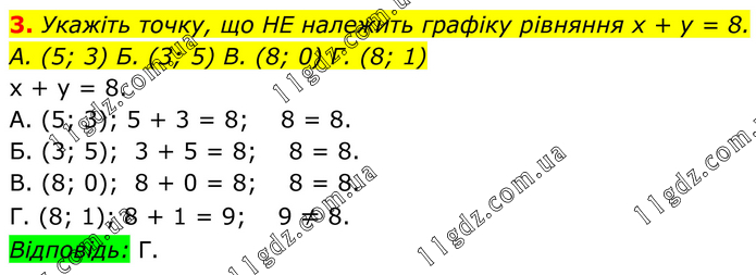 Укажіть точку, що НЕ належить графіку рівняння х + у = 8. А. (5; 3) Б. (3; 5) В. (8; 0) Г. (8; 1) x + y = 8. A. (5; 3); 5 + 3 = 8; 8 = 8. Б. (3; 5); 3 + 5 = 8; 8 = 8. B. (8; 0); 8 + 0 = 8; 8 = 8. Г. (8; 1); 8 + 1 = 9; 9 ≠ 8. Відповідь: Г.