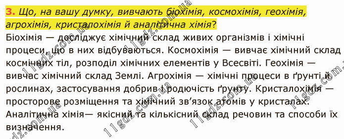Що, на вашу думку, вивчають біохімія, космохімія, геохімія, агрохімія, кристалохімія й аналітична хімія? Біохімія — досліджує хімічний склад живих організмів і хімічні процеси, що в них відбуваються. Космохімія — вивчає хімічний склад космічних тіл, розподіл хімічних елементів у Всесвіті. Геохімія — вивчас хімічний склад Землі. Агрохімія — хімічні процеси в ґрунті й рослинах, застосування добрив і родючість ґрунту. Кристалохімія — просторове розміщення та хімічний зв’язок атомів у кристалах. Аналітична хімія— якісний та кількісний склад речовин та способи їх визначення.