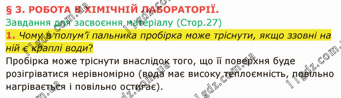 § 3. РОБОТА В ХІМІЧНІЙ ЛАБОРАТОРІЇ. Завдання для засвоєння матеріалу (Стор.27) 1. Чому в полум’ї пальника пробірка може тріснути, якщо ззовні на ній є краплі води? Пробірка може тріснути внаслідок того, що її поверхня буде розігріватися нерівномірно (вода має високу теплоємність, повільно нагрівається і повільно остигає).