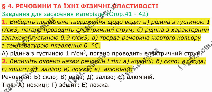§ 4. РЕЧОВИНИ ТА ЇХНІ ФІЗИЧНІ ВЛАСТИВОСТІ Завдання для засвоєння матеріалу (Стор.41 - 42) 1. Виберіть правильне твердження щодо води: а) рідина з густиною 1 г/см3, погано проводить електричний струм; б) рідина з характерним запахом і густиною 0,9 г/см3; в) тверда речовина жовтого кольору з температурою плавлення 0 °С. А) рідина з густиною 1 г/см3, погано проводить електричний струм. 2. Випишіть окремо назви речовин і тіл: а) ножиці; б) скло; в) вода; г) зошит; д) залізо; е) ложка; є) алюміній; Речовини: Б) скло; В) вода; Д) залізо; Є) алюміній. Тіла: А) ножиці; Г) зошит; Е) ложка.
