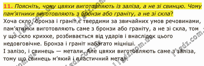 Поясніть, чому цвяхи виготовляють із заліза, а не зі свинцю. Чому пам’ятники виготовляють з бронзи або граніту, а не зі скла? Хоча скло, бронза і граніт є твердими за звичайних умов речовинами, пам’ятники виготовляють саме з бронзи або граніту, а не зі скла, том у що скло крихке, розбивається від ударів і внаслідок цього недовговічне. Бронза і граніт набагато міцніші. І залізо, і свинець — метали. Але цвяхи виготовляють саме з заліза, тому що свинець м’який і пластичний метал.