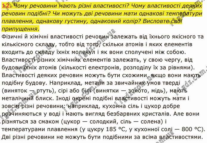 Чому речовини мають різні властивості? Чому властивості деяких речовин подібні? Чи можуть дві речовини мати однакові температури плавлення, однакову густину, однаковий колір? Висловте свої припущення. Фізичні й хімічні властивості речовин залежать від їхнього якісного та кількісного складу, тобто від того, скільки атомів і яких елементів входить до складу їхніх молекул і як вони сполучені між собою. Властивості різних хімічних елементів залежать, у свою чергу, від будови їхніх атомів (кількості електронів, розподілу їх за рівнями). Властивості деяких речовин можуть бути схожими, якщо вони мають подібну будову. Наприклад, метали за звичайних умов тверді (виняток — ртуть), сірі або білі (винятки — золото, мідь), мають металічний блиск. Іноді окремі подібні властивості можуть мати і зовсім різні речовини: наприклад, кухонна сіль і цукор добре розчиняються у воді і мають вигляд безбарвних кристалів. Але вони різняться за смаком (цукор — солодкий, сіль — солена) і температурами плавлення (у цукру 185 °С, у кухонної солі — 800 °С). Дві різні речовини не можуть бути подібними за всіма властивостями.