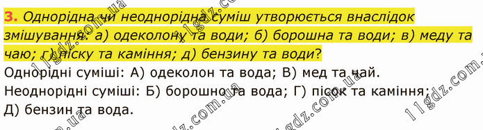 Однорідна чи неоднорідна суміш утворюється внаслідок змішування: а) одеколону та води; б) борошна та води; в) меду та чаю; г) піску та каміння; д) бензину та води? Однорідні суміші: А) одеколон та вода; В) мед та чай. Неоднорідні суміші: Б) борошно та вода; Г) пісок та каміння; Д) бензин та вода.