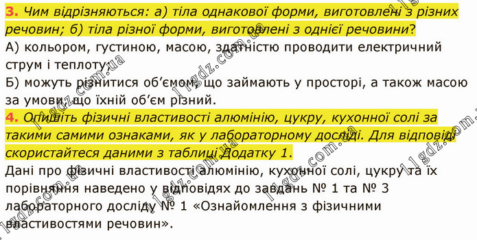 Чим відрізняються: а) тіла однакової форми, виготовлені з різних речовин; б) тіла різної форми, виготовлені з однієї речовини? А) кольором, густиною, масою, здатністю проводити електричний струм і теплоту; Б) можуть різнитися об’ємом, що займають у просторі, а також масою за умови, що їхній об’єм різний. 4. Опишіть фізичні властивості алюмінію, цукру, кухонної солі за такими самими ознаками, як у лабораторному досліді. Для відповіді скористайтеся даними з таблиці Додатку 1. Дані про фізичні властивості алюмінію, кухонної солі, цукру та їх порівняння наведено у відповідях до завдань № 1 та № 3 лабораторного досліду № 1 «Ознайомлення з фізичними властивостями речовин».