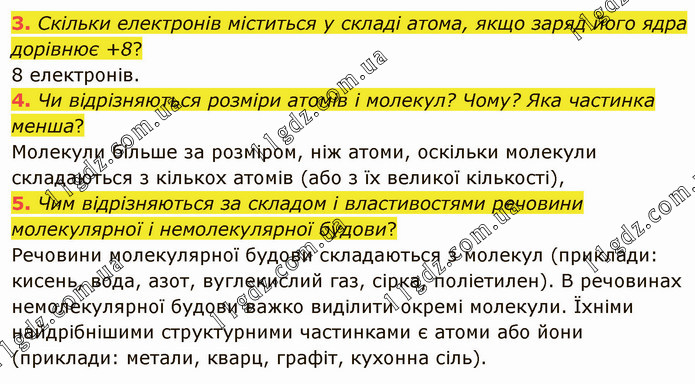 Скільки електронів міститься у складі атома, якщо заряд його ядра дорівнює +8? 8 електронів. 4. Чи відрізняються розміри атомів і молекул? Чому? Яка частинка менша? Молекули більше за розміром, ніж атоми, оскільки молекули складаються з кількох атомів (або з їх великої кількості), 5. Чим відрізняються за складом і властивостями речовини молекулярної і немолекулярної будови? Речовини молекулярної будови складаються з молекул (приклади: кисень, вода, азот, вуглекислий газ, сірка, поліетилен). В речовинах немолекулярної будови важко виділити окремі молекули. Їхніми найдрібнішими структурними частинками є атоми або йони (приклади: метали, кварц, графіт, кухонна сіль).
