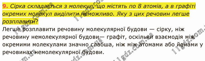 Сірка складається з молекул, що містять по 8 атомів, а в графіті окремих молекул виділити неможливо. Яку з цих речовин легше розплавити? Легше розплавити речовину молекулярної будови — сірку, ніж речовину немолекулярної будови— графіт, оскільки взаємодія між окремими молекулами значно слабша, ніж між атомами або йонами у речовинах немолекулярної будови.