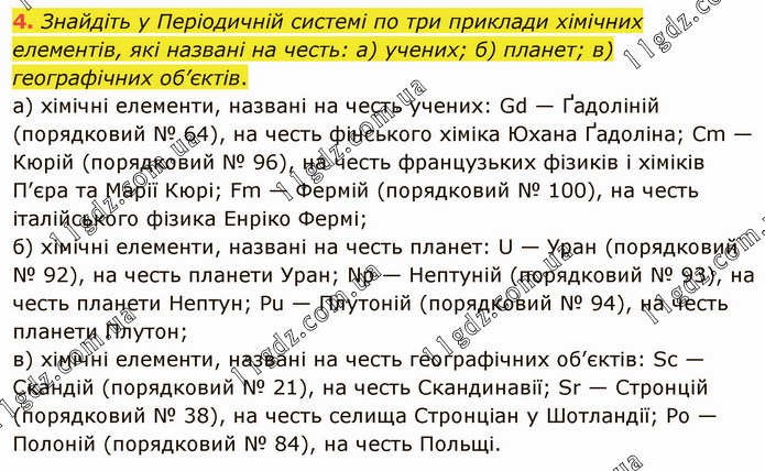 Знайдіть у Періодичній системі по три приклади хімічних елементів, які названі на честь: а) учених; б) планет; в) географічних об’єктів. а) хімічні елементи, названі на честь учених: Gd — Ґадоліній (порядковий № 64), на честь фінського хіміка Юхана Ґадоліна; Сm — Кюрій (порядковий № 96), на честь французьких фізиків і хіміків П’єра та Марії Кюрі; Fm — Фермій (порядковий № 100), на честь італійського фізика Енріко Фермі; б) хімічні елементи, названі на честь планет: U — Уран (порядковий № 92), на честь планети Уран; Nр — Нептуній (порядковий № 93), на честь планети Нептун; Рu — Плутоній (порядковий № 94), на честь планети Плутон; в) хімічні елементи, названі на честь географічних об’єктів: Sс — Скандій (порядковий № 21), на честь Скандинавії; Sr — Стронцій (порядковий № 38), на честь селища Стронціан у Шотландії; Ро — Полоній (порядковий № 84), на честь Польщі.