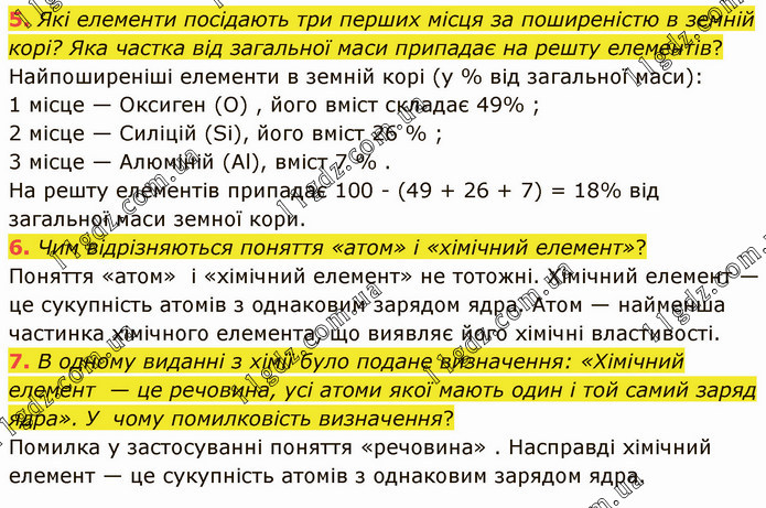 Які елементи посідають три перших місця за поширеністю в земній корі? Яка частка від загальної маси припадає на решту елементів? Найпоширеніші елементи в земній корі (у % від загальної маси): 1 місце — Оксиген (О) , його вміст складає 49% ; 2 місце — Силіцій (Sі), його вміст 26 % ; 3 місце — Алюміній (Аl), вміст 7 % . На решту елементів припадає 100 - (49 + 26 + 7) = 18% від загальної маси земної кори. 6. Чим відрізняються поняття «атом» і «хімічний елемент»? Поняття «атом» і «хімічний елемент» не тотожні. Хімічний елемент — це сукупність атомів з однаковим зарядом ядра. Атом — найменша частинка хімічного елемента, що виявляє його хімічні властивості. 7. В одному виданні з хімії було подане визначення: «Хімічний елемент — це речовина, усі атоми якої мають один і той самий заряд ядра». У чому помилковість визначення? Помилка у застосуванні поняття «речовина» . Насправді хімічний елемент — це сукупність атомів з однаковим зарядом ядра.