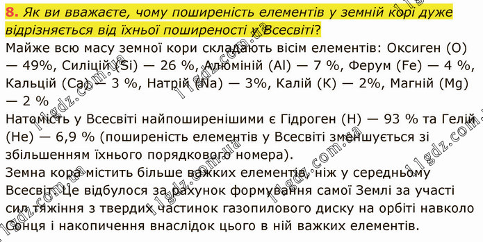 Як ви вважаєте, чому поширеність елементів у земній корі дуже відрізняється від їхньої поширеності у Всесвіті? Майже всю масу земної кори складають вісім елементів: Оксиген (О) — 49%, Силіцій (Sі) — 26 %, Алюміній (Аl) — 7 %, Ферум (Fе) — 4 %, Кальцій (Са) — 3 %, Натрій (Nа) — 3%, Калій (К) — 2%, Магній (Mg) — 2 % Натомість у Всесвіті найпоширенішими є Гідроген (Н) — 93 % та Гелій (Не) — 6,9 % (поширеність елементів у Всесвіті зменшується зі збільшенням їхнього порядкового номера). Земна кора містить більше важких елементів, ніж у середньому Всесвіт. Це відбулося за рахунок формування самої Землі за участі сил тяжіння з твердих частинок газопилового диску на орбіті навколо Сонця і накопичення внаслідок цього в ній важких елементів.
