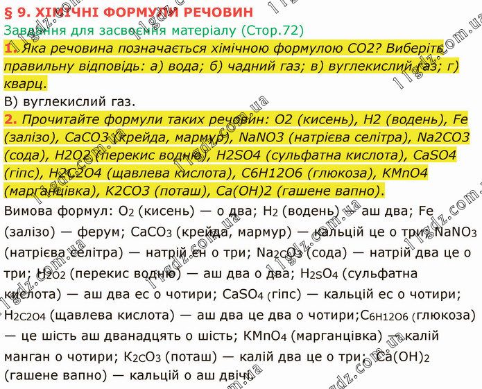 § 9. ХІМІЧНІ ФОРМУЛИ РЕЧОВИН Завдання для засвоєння матеріалу (Стор.72) 1. Яка речовина позначається хімічною формулою CO2? Виберіть правильну відповідь: а) вода; б) чадний газ; в) вуглекислий газ; г) кварц. В) вуглекислий газ. 2. Прочитайте формули таких речовин: O2 (кисень), H2 (водень), Fe (залізо), CaCO3 (крейда, мармур), NaNO3 (натрієва селітра), Na2CO3 (сода), H2O2 (перекис водню), H2SO4 (сульфатна кислота), CaSO4 (гіпс), H2C2O4 (щавлева кислота), C6H12O6 (глюкоза), KMnO4 (марганцівка), K2CO3 (поташ), Ca(OH)2 (гашене вапно). Вимова формул: O2 (кисень) — о два; Н2 (водень) — аш два; Fе (залізо) — ферум; СаСO3 (крейда, мармур) — кальцій це о три; NaNO3 (натрієва селітра) — натрій єн о три; Na2CO3 (сода) — натрій два це о три; Н2O2 (перекис водню) — аш два о два; Н2SO4 (сульфатна кислота) — аш два ес о чотири; СаSО4 (гіпс) — кальцій ес о чотири; Н2С2O4 (щавлева кислота) — аш два це два о чотири;С6Н12O6 (глюкоза) — це шість аш дванадцять о шість; КМnO4 (марганцівка) — калій манган о чотири; К2СO3 (поташ) — калій два це о три; Са(ОН)2 (гашене вапно) — кальцій о аш двічі.