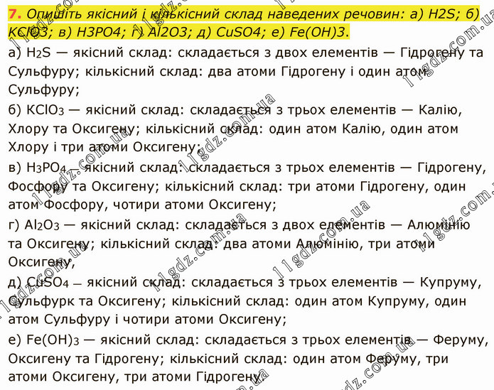 Опишіть якісний і кількісний склад наведених речовин: а) H2S; б) KClO3; в) H3PO4; г) Al2O3; д) CuSO4; е) Fe(OH)3. а) Н2S — якісний склад: складається з двох елементів — Гідрогену та Сульфуру; кількісний склад: два атоми Гідрогену і один атом Сульфуру; б) КСlO3 — якісний склад: складається з трьох елементів — Калію, Хлору та Оксигену; кількісний склад: один атом Калію, один атом Хлору і три атоми Оксигену; в) Н3РO4 — якісний склад: складається з трьох елементів — Гідрогену, Фосфору та Оксигену; кількісний склад: три атоми Гідрогену, один атом Фосфору, чотири атоми Оксигену; г) Аl2O3 — якісний склад: складається з двох елементів — Алюмінію та Оксигену; кількісний склад: два атоми Алюмінію, три атоми Оксигену, д) СuSO4 — якісний склад: складається з трьох елементів — Купруму, Сульфурк та Оксигену; кількісний склад: один атом Купруму, один атом Сульфуру і чотири атоми Оксигену; е) Fе(ОН)3 — якісний склад: складається з трьох елементів — Феруму, Оксигену та Гідрогену; кількісний склад: один атом Феруму, три атоми Оксигену, три атоми Гідрогену.