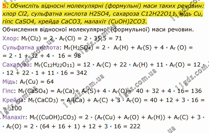 Обчисліть відносні молекулярні (формульні) маси таких речовин: хлор Cl2, сульфатна кислота H2SO4, сахароза C12H22O11, мідь Cu, гіпс CaSO4, крейда CaCO3, малахіт (CuOH)2CO3. Обчислення відносної молекулярної (формульної) маси речовин. Хлор: Мr(Сl2) = 2 ∙ Аr(Сl) = 2 ∙ 35,5 = 71 Сульфатна кислота: Мr(H2SO4) = 2 ∙ Аr(Н) + Аr(S) + 4 ∙ Аr (О) = = 2 ∙ 1 + 32 + 4 ∙ 16 = 98 Сахароза: Мr(С12Н22О11) = 12 ∙ Аr(С) + 22 ∙ Аr(Н) + 11 ∙ Аr(О) = 12 ∙ ∙ 12 + 22 ∙ 1 + 11 ∙ 16 = 342 Мідь: Аr(Сu) = 64 Гіпс: Мr(СаSО4) = Аr(Са)+ Аr(S)+ 4 ∙ Аr(О)= 40 + 32 + 4 ∙ 16= 136 Крейда: Мr(СаСO3) = Аr(Са) + Аr(С) + 3 ∙ Аr(О) = 40 + 12 + 3 ∙ 16 = = 100 Малахіт: Мr((СuOН)2СO3) = 2 ∙ (Аr(Сu) + Аr(O) + Аr(Н)) + Аr(С) + 3 ∙ ∙ Аr(O) = 2 ∙ (64 + 16 + 1) + 12 + 3 ∙ 16 = 222