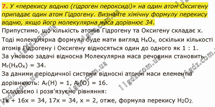 У «перекису водню (гідроген пероксиді)» на один атом Оксигену припадає один атом Гідрогену. Визначте хімічну формулу перекису водню, якщо його молекулярна маса дорівнює 34. Припустимо, що кількість атомів Гідрогену та Оксигену складає x. Тоді молекулярна формула буде мати вигляд НxОx, оскільки кількості атомів Гідрогену і Оксигену відносяться один до одного як 1 : 1. За умовою задачі відносна Молекулярна маса речовини становить Мr(НxОx) = 34. За даними періодичної системи відносні атомні маси елементів дорівнюють: Аr(Н) = 1, Аr(О) = 16. Складаємо і розв’язуємо рівняння: 1х + 16x = 34, 17x = 34, х = 2, отже, формула перекису Н2O2.